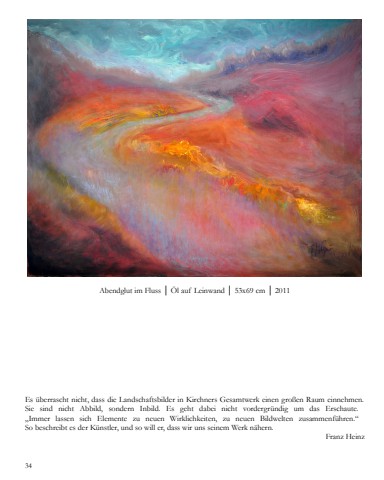 Abendglut im Fluss %u2502 %u00d6l auf Leinwand %u2502 53x69 cm %u2502 2011Es %u00fcberrascht nicht, dass die Landschaftsbilder in Kirchners Gesamtwerk einen gro%u00dfen Raum einnehmen.Sie sind nicht Abbild, sondern Inbild. Es geht dabei nicht vordergr%u00fcndig um das Erschaute. %u201eImmer lassen sich Elemente zu neuen Wirklichkeiten, zu neuen Bildwelten zusammenf%u00fchren.%u201c So beschreibt es der K%u00fcnstler, und so will er, dass wir uns seinem Werk n%u00e4hern.Franz Heinz 34